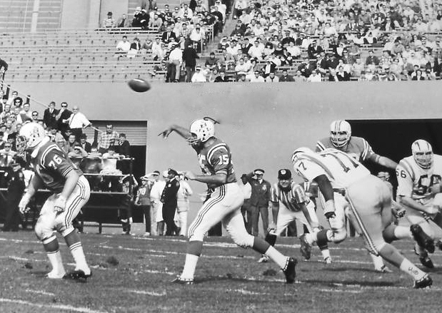 Boston Patriots quarterback Babe Parilli fires a pass downfield in a game against the San Diego Chargers played at Fenway Park in 1968, the last year football was played at Fenway Park.