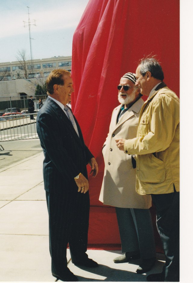 Hank Evanish (benefactor), Franc Talarico (sculptur) and Red Sox owner Larry Lucchino chat before the ceremonies.