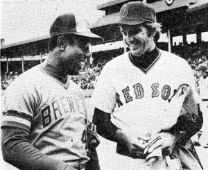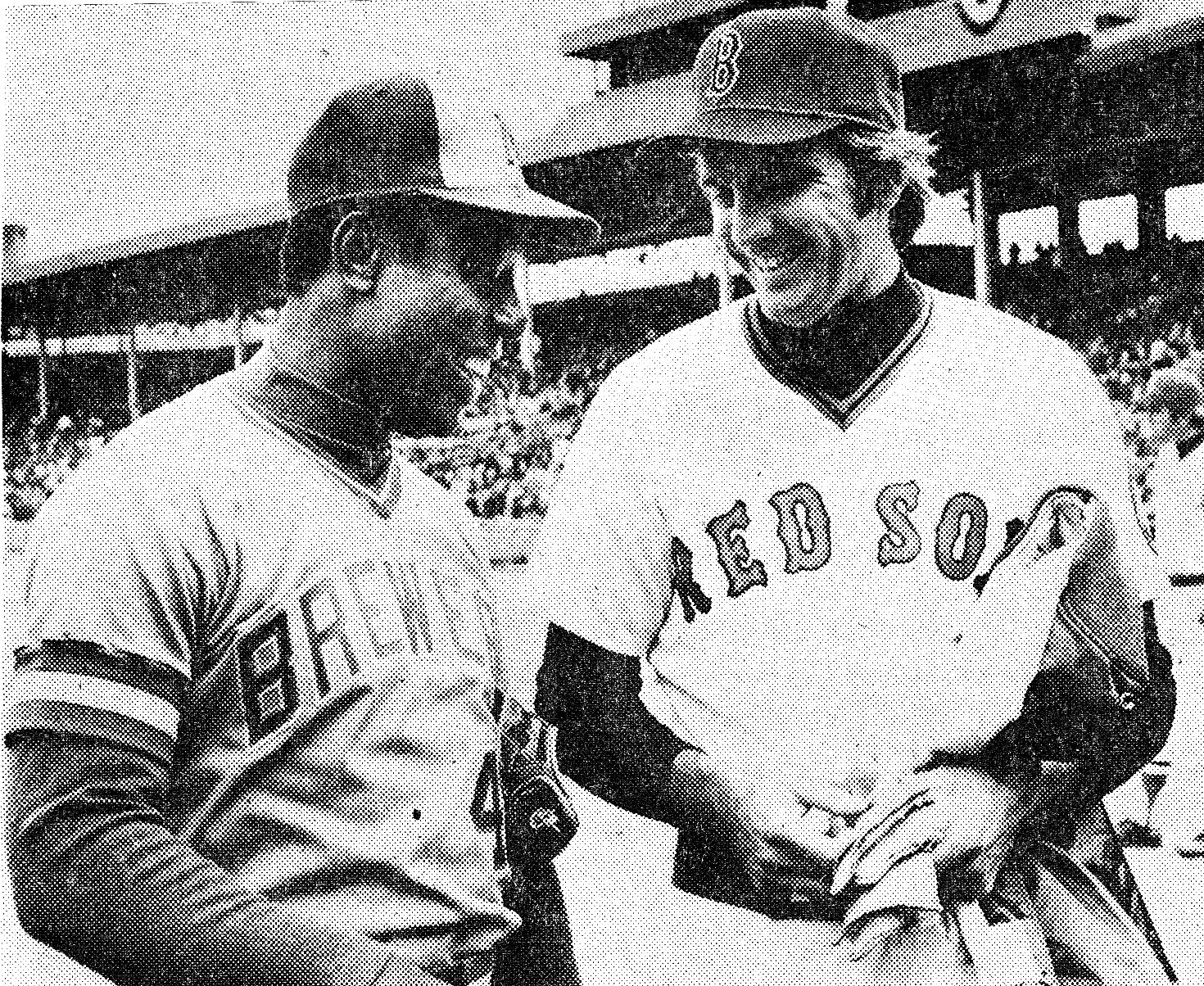 He was back! Having had a terrific spring, he not only made the squad but he was penciled in to DH and bat fourth on opening day at Fenway! History of another sort was also being made as all time home run champ Hank Aaron was making his American League debut as the Milwaukee Brewers DH. The poignancy of this dichotomy was not lost on the Fenway Faithful and they responded in kind with six standing ovations; two for the all time home run king and four for the return of the local kid whose last name ended in a vowel.