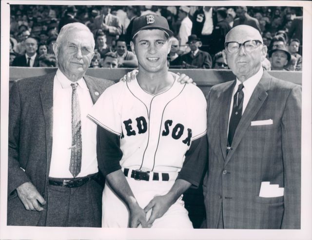 Harry Hooper, Carl Yastrzemski, and Duffy Lewis in 1962 at Fenway Park for the 50th Anniversary of the 1912 World Champion Red Sox.
