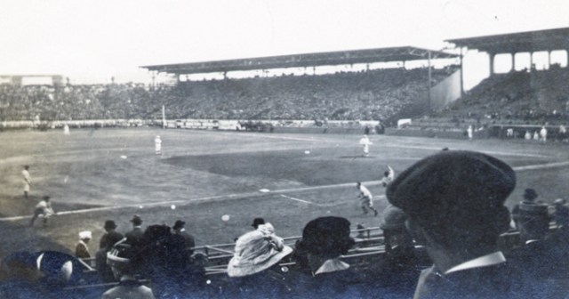 Ray Collins warms up October 9, 1912 at Fenway Park, Fenway’s first World Series game.