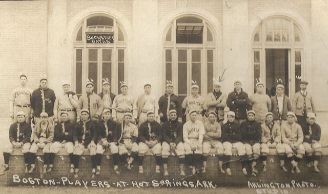 Charley Hall, arms folded over the A in Arlington, with the Red Sox in Hot Springs Arkansas in the spring of 1912.