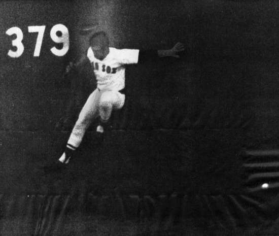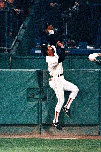 Fred Lynn in a heap at the base of the wall in the fifth inning following his attempt to catch Ken Griffey’s (Daddy) triple. It was this near disaster which led to padding on the outfield wall.