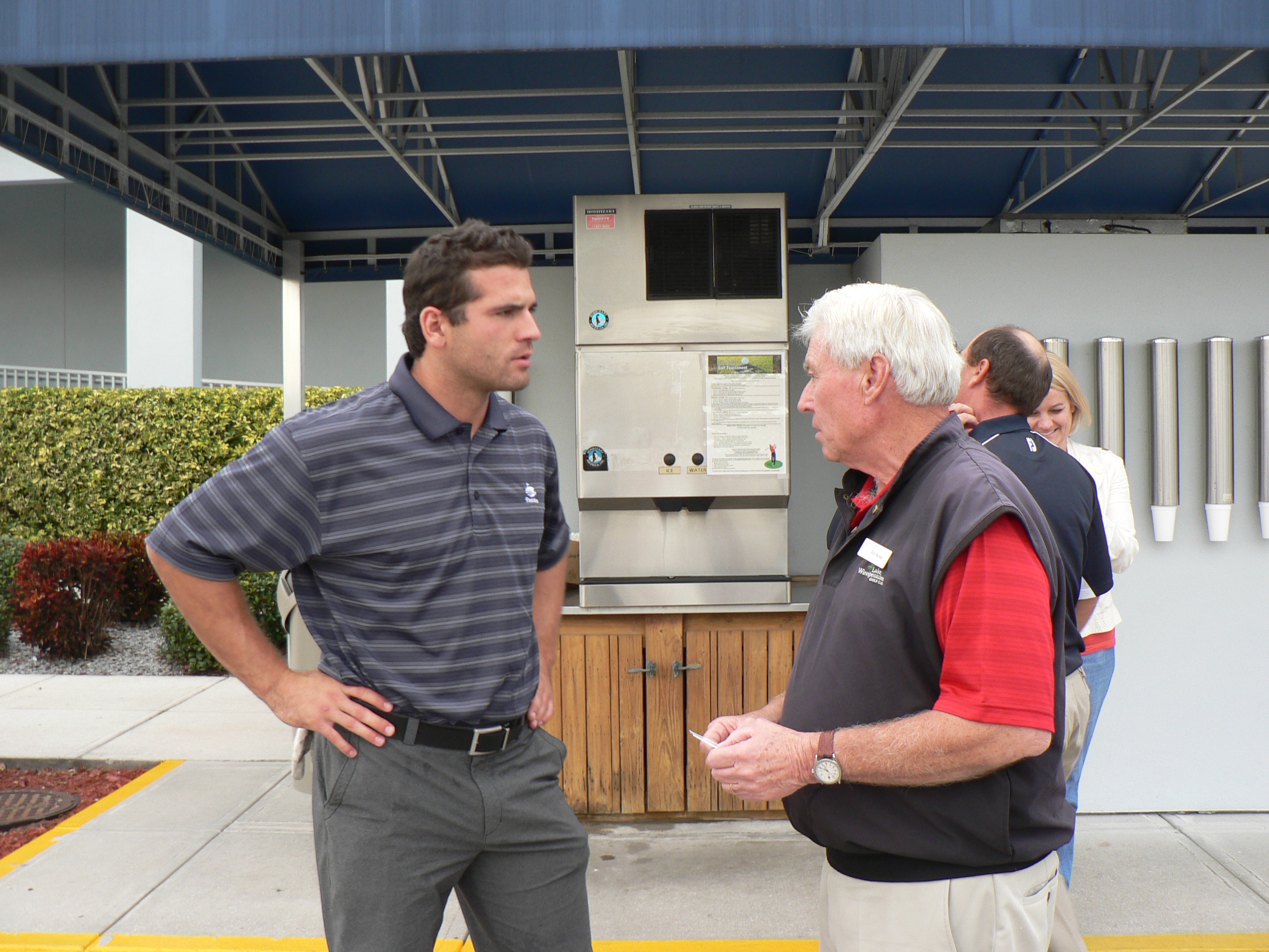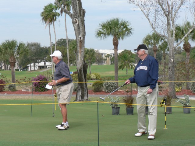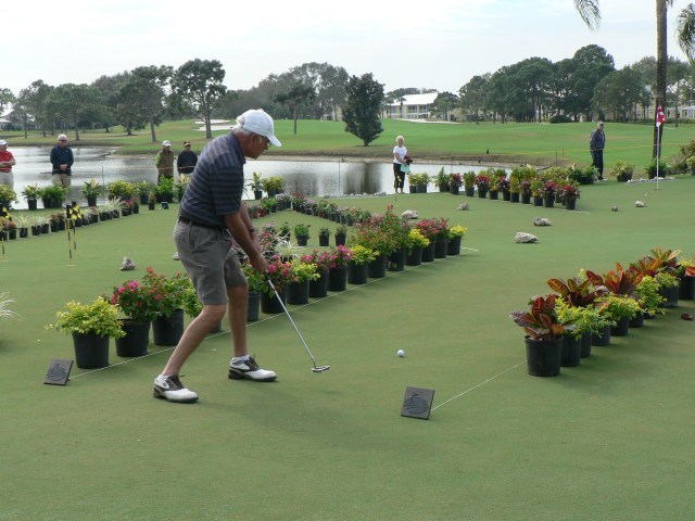 The putting green is laid out in a nine-hole challenge where celebrity pairs competed to best the score shot by Plantation’s Director of Golf Operations Keith Struble and Head Pro Mike Domalski. Yesterday they shot 17.