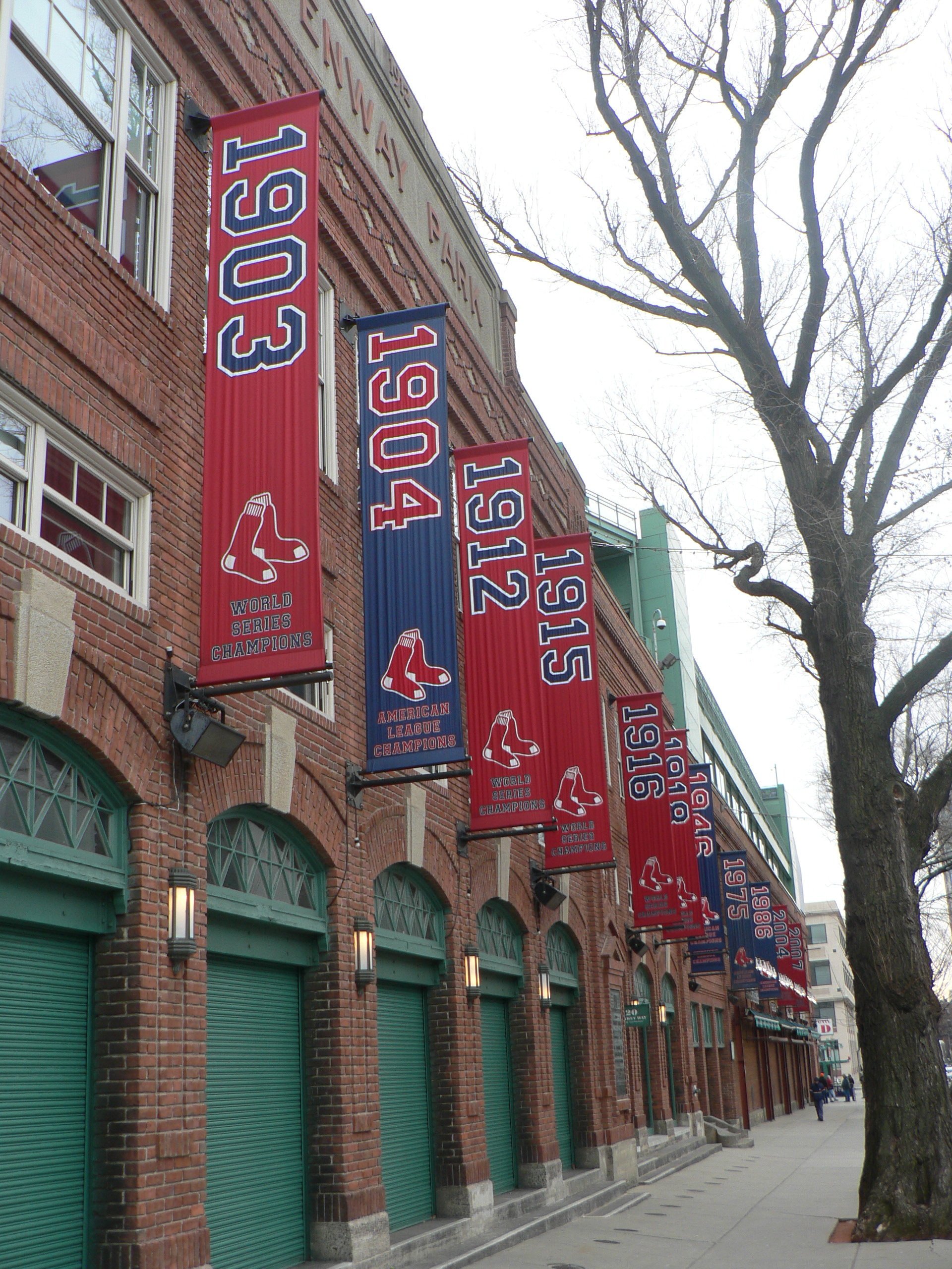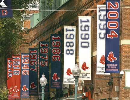 Looking down Yawkey Way, the banners indicate the years pennant banners and World Series banners flew above Fenway Park.