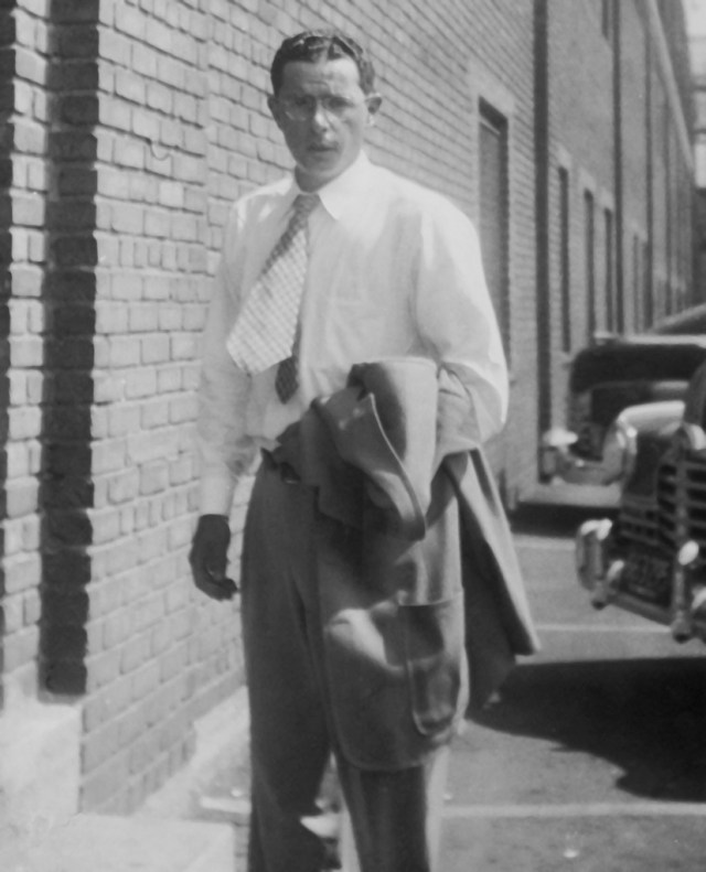 Dominic DiMaggio heads into Fenway after parking his car in the lot on Van Ness Street for a game in 1948.