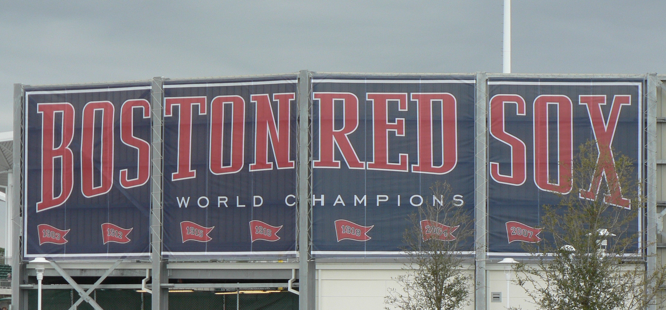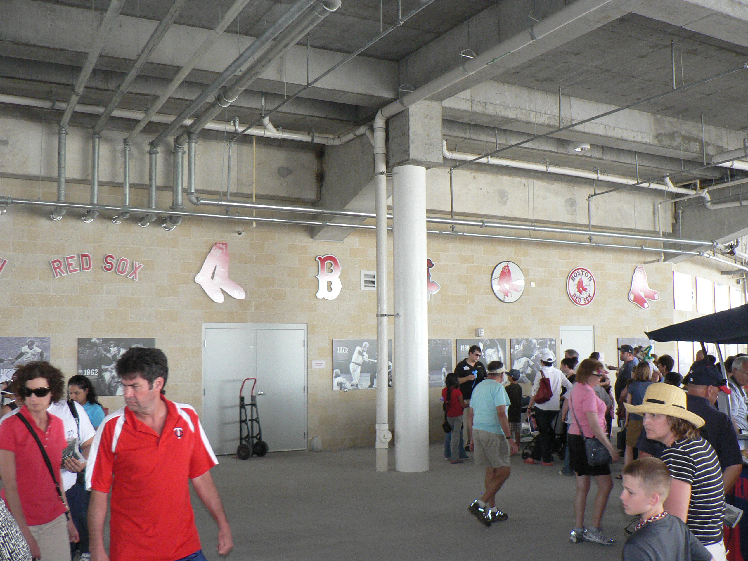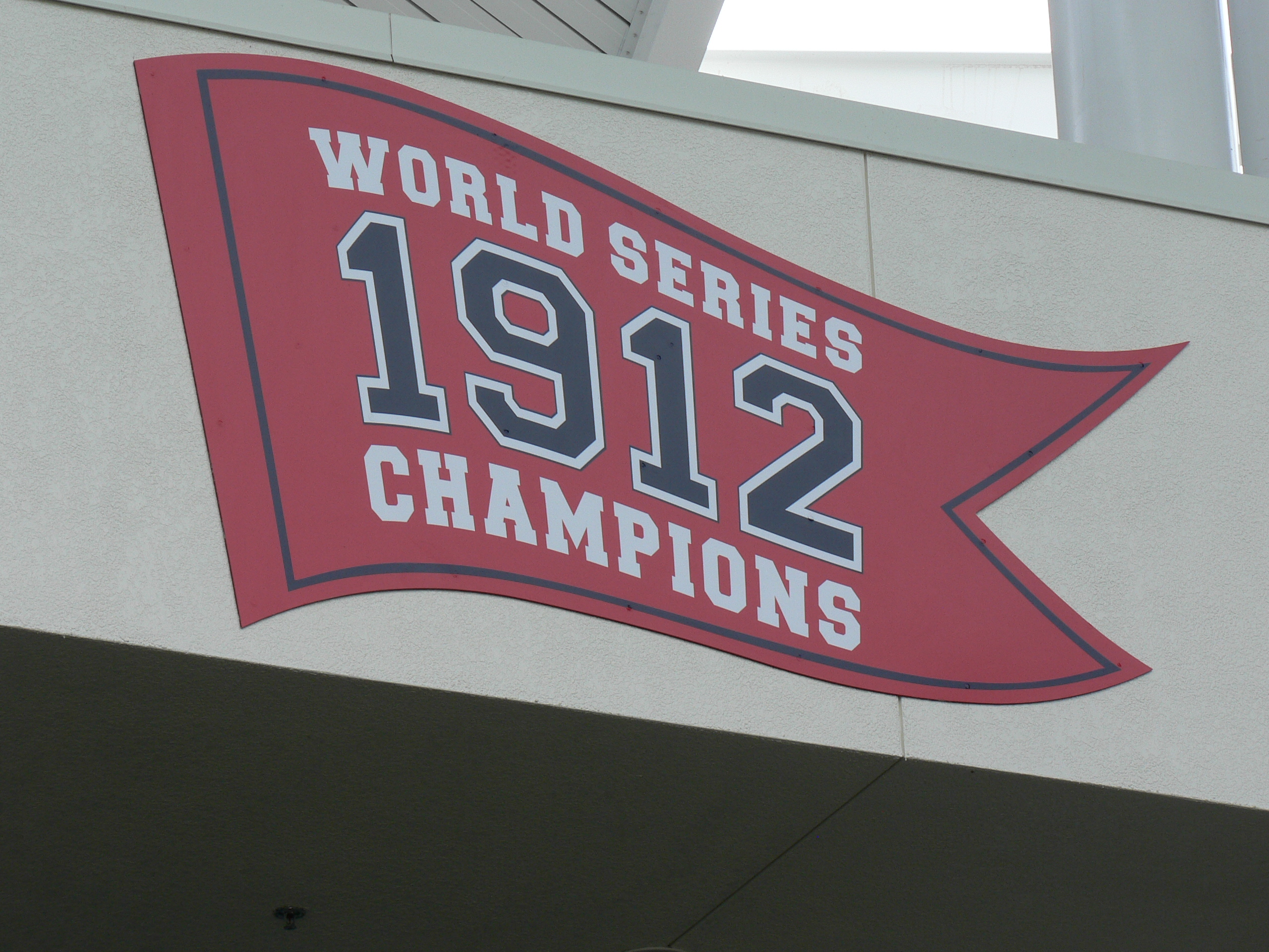 Decorated on walls throughout the facility are the symbols which are emblematic of the World Series the Red Sox have won.
