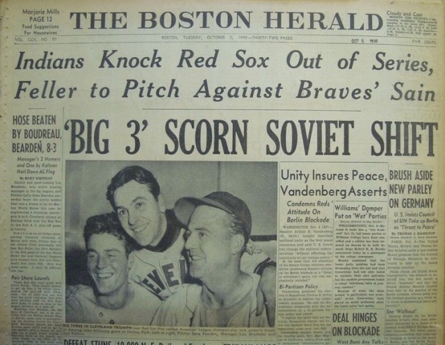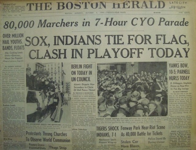 In Cleveland the Indians beat the Tigers clinching a first place tie. In Boston, Ted Williams hit a two run first inning homer sparking the Red Sox to a 5-1 win eliminating the Yankees and keeping their hopes alive for a tie.