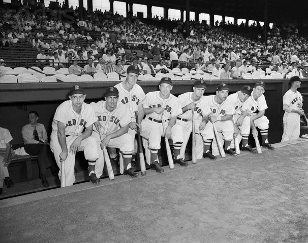 The Boston Red Sox in August of 1948, standing in their order in the lineup: Dom DiMaggio CF, Johnny Pesky 3B, Ted Williams LF, Vern Stephens SS, Bobby Doerr 2B, Stan Spence RF, Billy Goodman 1B and Birdie Tebbets C.