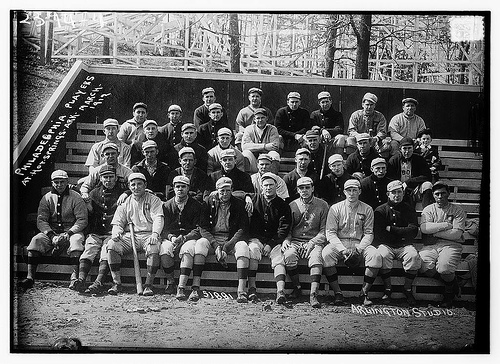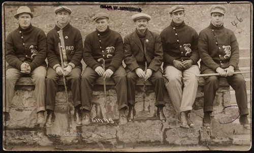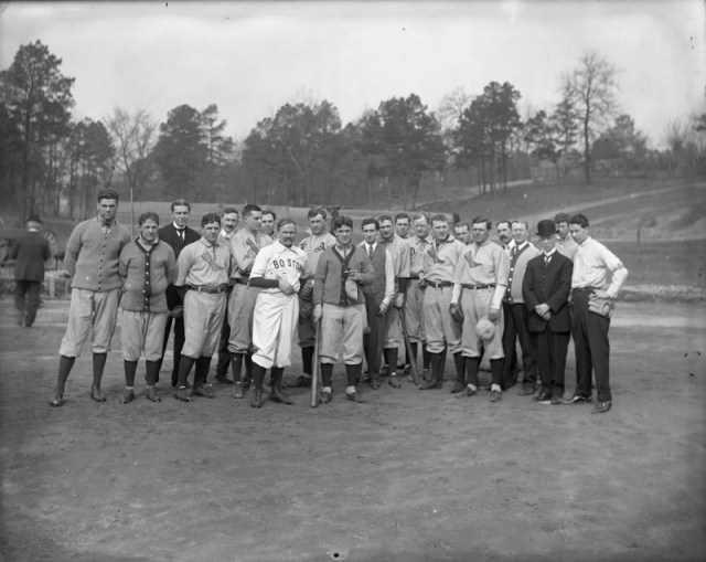 Bill Carrigan (far left) and “Nuf Ced” (4th from left) hanging out with a few of the boys during the Spring of 1912.