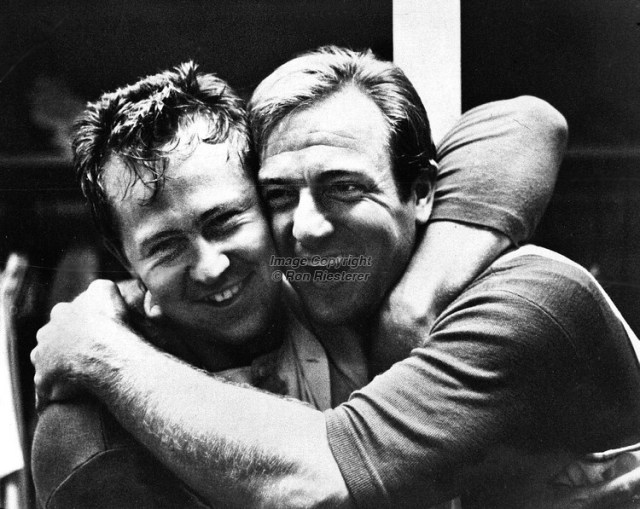 Earl Wilson (who pitched a no-hitter six weeks earlier) greets “Monbo” after his no-hitter August 1, 1962. Smiling between them is catcher Jim Pagliaroni.