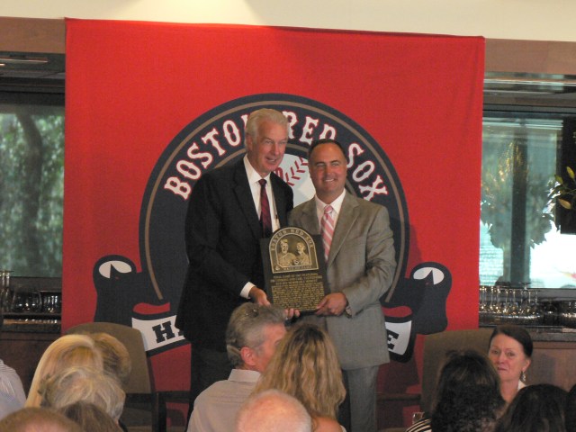 Jim Lonborg accepts the Memorable Moment plaque from NESN’s voice of the Red Sox, Don Orsillo.