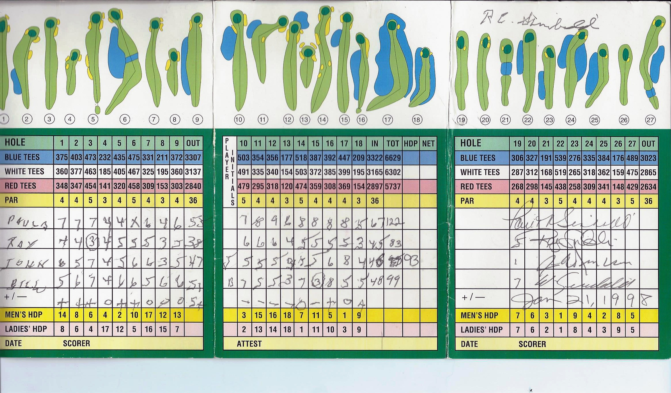 Dad’s last day on a golf course. He drove while my sister-in-law Paula and I took on my brother Willie and a friend John. Paula and I WON!!! Everyone signed the card.