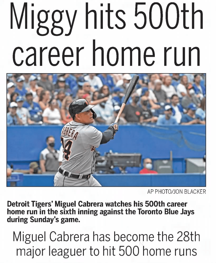 “Miggy” hit his 500th August 22, 2021, in Toronto off of Steven Matz. It was 11 days past the 92nd anniversary of The Babe’s 500th circuit clout. It came in the 10,873-plate appearance of his career, arriving at 500 with a homer every 21.74 times he batted.