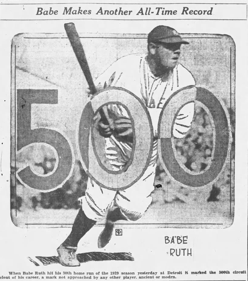 He hit number 500 on the 11th of August 1929 in Cleveland off of Willis Hudlin; in the second inning, giving the Yanks a 1-0 lead in a game they would eventually lose 6-5. It was the 7335th plate appearance of his career. He arrived at 500 homers at a rate of one for every 14.67 plate appearance.